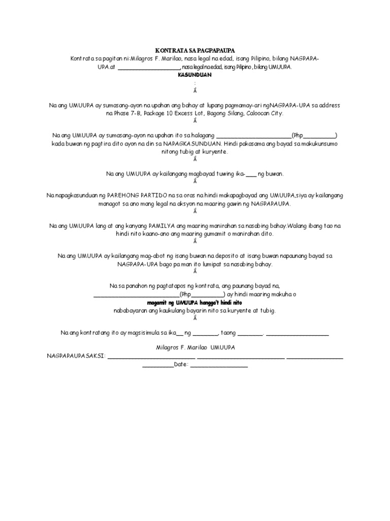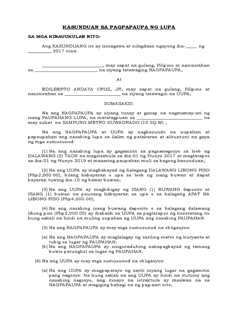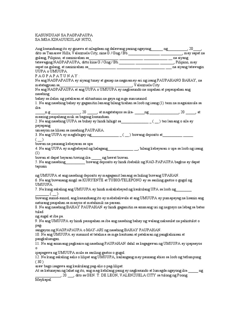 Download & view kasunduan sa pagpapaupa as pdf for free. Kasunduan sa pagpapaupa sa mga kinauukulan nito, ang kasunduang ito ay ginawa at nilagdaan ng dalawang paning ngayong 9 ng mayo, 2019, dito sa blk 64 lot 19 brgy sto cristo. Kasunduan sa pagpapaupa sa mga kinauukulan nito, ang kasunduang ito ay ginawa at nilagdaan ng dalawang paning ngayong _ ng _, 20____, dito sa tamaraw hills. Aniya, ang naranasang hirap sa buhay ang nagtutulak sa kanya para gumawa ng kabutihan. Para sa karagdagang impormasyon, tingnan ang bahagi j sa pahina 14.